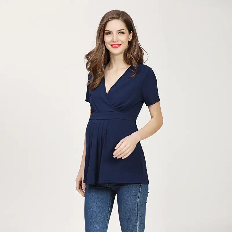 Embrace your style and comfort during your pregnancy with our beautifully designed V-neck short-sleeve maternity T-shirt. This shirt is not just a piece of clothing; it's a celebration of motherhood and personal style.